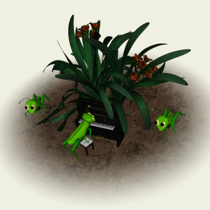 В сценарии тёплое лето, когда можно гулять и наблюдаю за прыгающими в траве кузнечиками. Эта музыка очень точно передаёт все движения кузнечиков. Понятно, где кузнечики бегают, где спокойно шествуют, а где и прыгают. Они очень интересные и забавные насекомые.